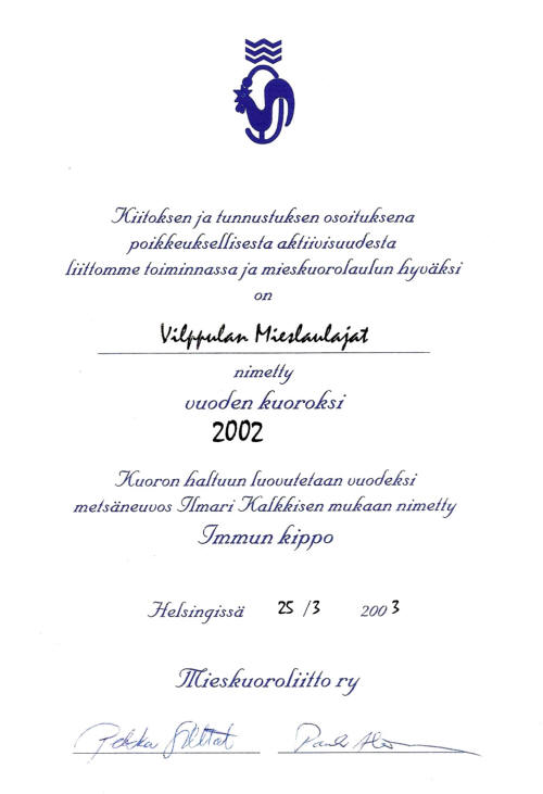 Vuoden kuoron kiertopalkinto Immun Kippo